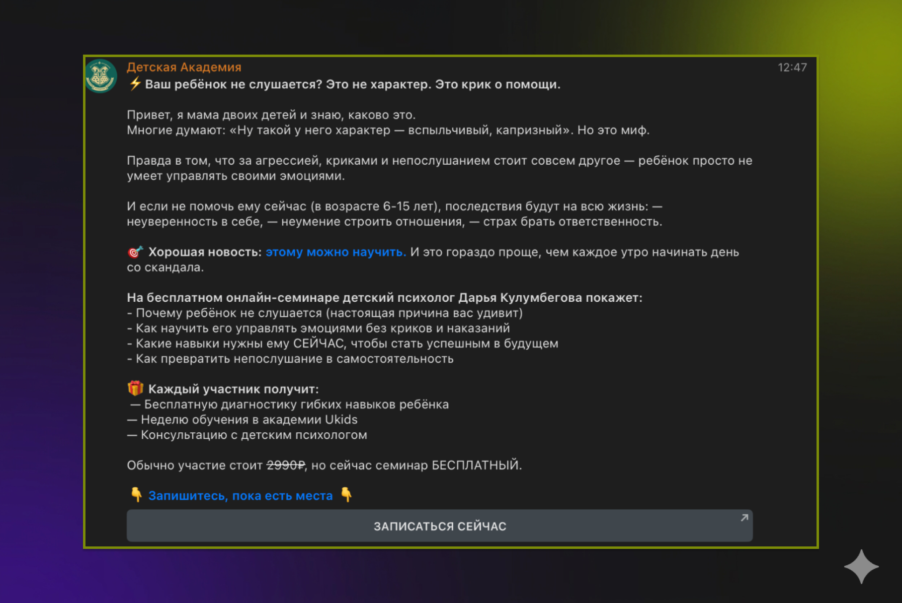 Если вы ведёте канал для мам, педагогов или родителей — вы буквально сидите на золотой жиле